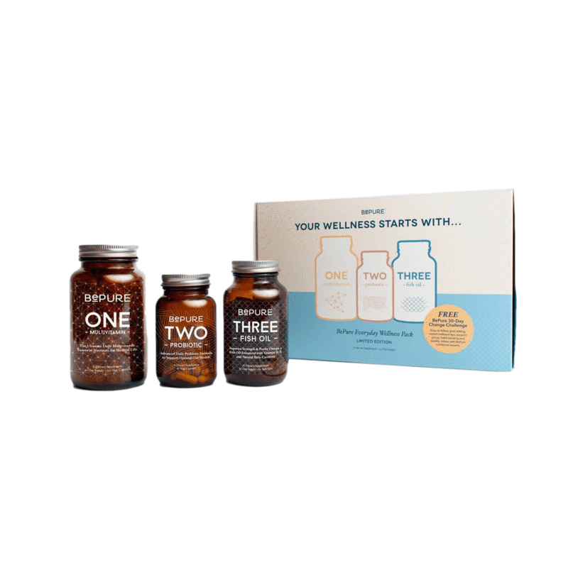 Wellness starts with One, Two, Three. The ultimate pack to simplify your wellness woes. BePure One, the ultimate multivitamin for your nutritional needs, BePure Two, a powerful probiotic for great gut health, and BePure Three, a high strength DHA/EPA fish oil for your essential omega 3 fats. PLUS each pack comes with a FREE 30-Day Change Challenge to set your new wellness routine up for success.