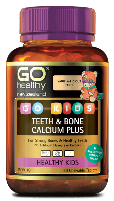 GO KIDS TEETH & BONE CALCIUM PLUS is a great tasting vanilla-licious Calcium chewable tablet, that kids will love! A fun and great way to top up your children’s daily intake of Calcium to help support healthy growth and development and encourage strong teeth and bones. This cute superbear shaped chewable tablet contains natural Calcium sourced from seaweed, plus Vitamin D3 and Vitamin K2, providing the perfect combination to ensure bones stay strong and healthy.