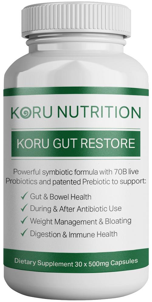Koru-Nutrition Koru Gut Restore is a proprietary symbiotic formulation that pairs a patented prebiotic with 9 strains of powerful live probiotics to work together to support a balanced, healthy gut so you can enjoy the simple pleasures in life.Â
