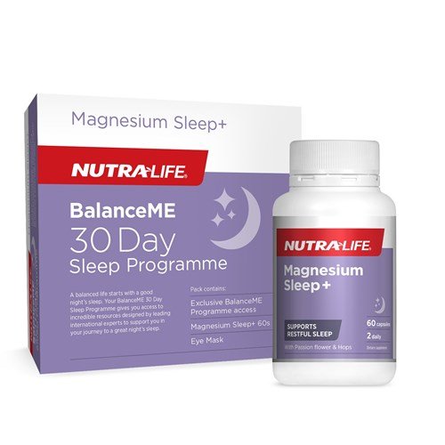 A balanced life starts with a good night's sleep. The box contains Nutra-Life Magnesium Sleep+ 60s, an eye mask and access to an exclusive BalanceME Programme