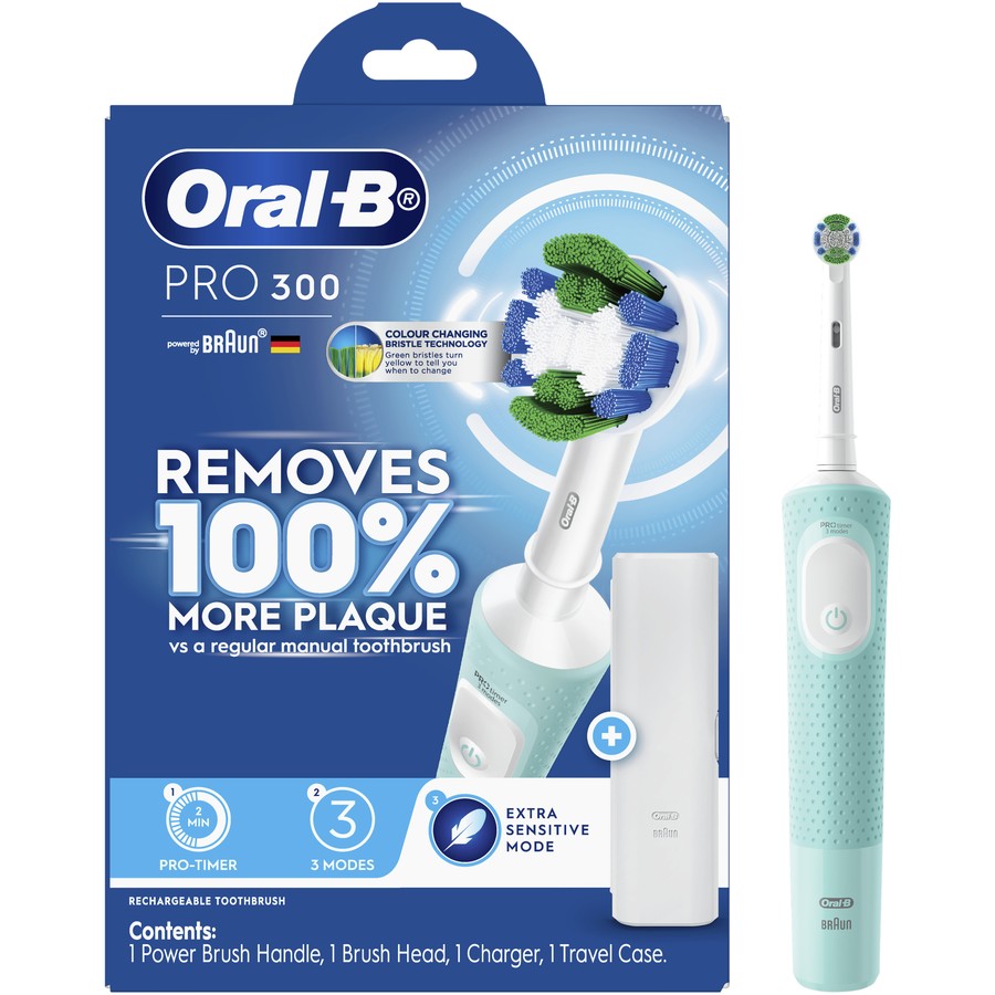 A Deeper Clean that protects gums. The Pro 300 electric toothbrush comes with a round brush head that surrounds each tooth for cleaner teeth and healthier gums, removing 100% more plaque compared to a manual toothbrush.