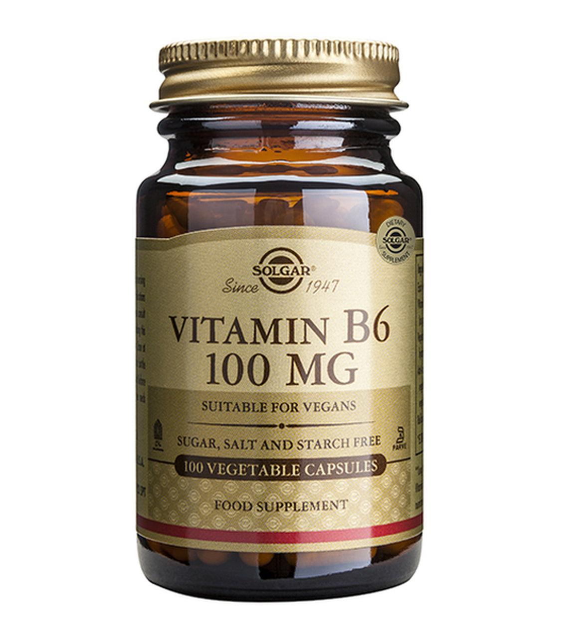 Solgar Vitamin B6 100 mg (pyridoxine HCL) is a high potency capsule and part of the essential Vitamin B Complex. As a water soluble vitamin we need to ensure that we have adequate supply every day. Vitamin B6 is best known to help support hormonal balance and the nervous system. Important for the “feel good” neurotransmitters – serotonin and dopamine. These neurotransmitters are linked with mood balance, calmness and the proper function of the nervous system. Women often take Vitamin B6 to support premenstrual balance. Suitable for vegans and vegetarians.